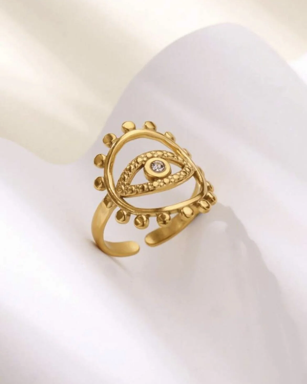 Shop All › Evil Eye Ring Image 1 of 2 Image 2 of 2 Evil Eye Ring $25.00 Adjustable Add to Cart Added! Adjustable Stainless SteelGold PlatedAdjustable